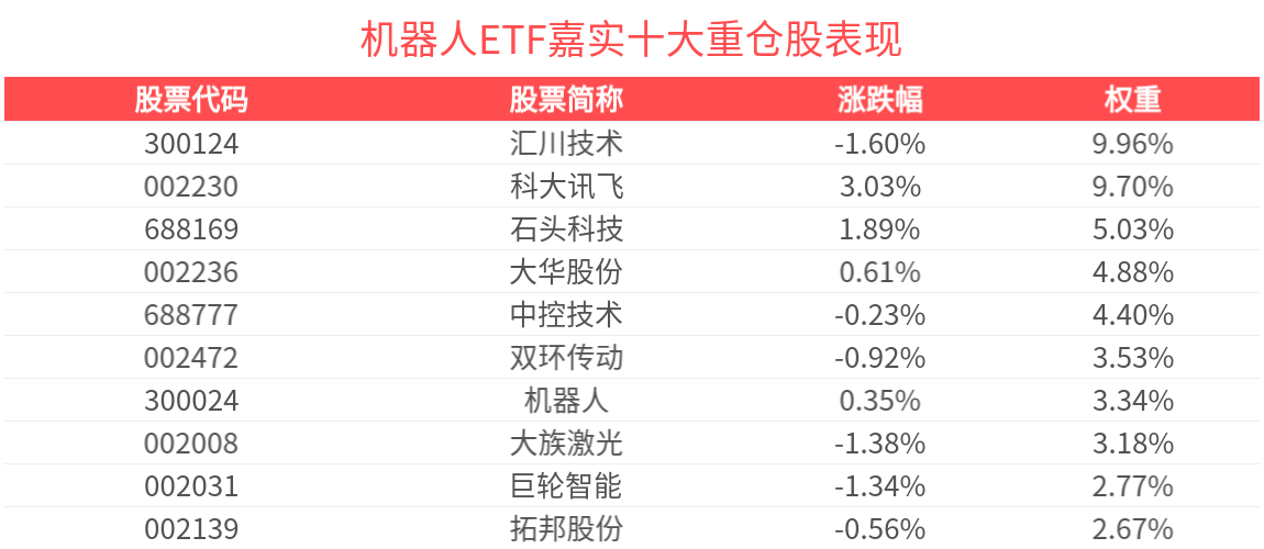 数据显示,截至2025年6月30日,中证机器人指数前十大权重股分别为汇川技术、科大讯飞、石头科技、大华股份、中控技术、双环传动、机器人、大族激光、巨轮智能、拓邦股份,前十大权重股合计占比49.58%。